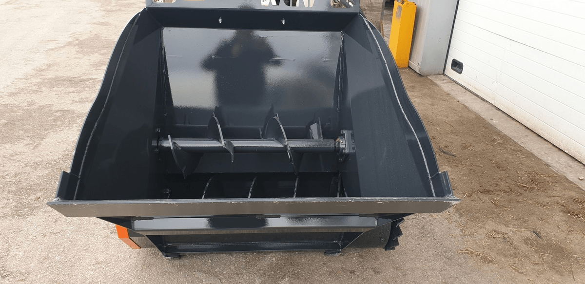 - 1 - Godet distributeur d’aliments à 1 vis pour répartir des aliments type ensilage de maïs ou d’herbe en brins ou aliments courts. Distribution sur le côté par vis en fond. Sortie à gauche avec possibilité de 2 sorties en option. Sortie à droite possible. Un désilage par griffe ou couteau ainsi qu’un coupe betteraves ou pommes de terre et aussi faisable en option. La capacité du godet va 985 L à 2 500 L.