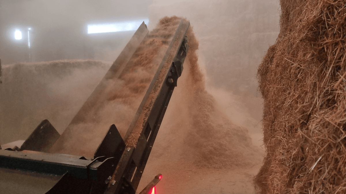Le broyeur PIRANHA pour paille ou foin conçu pour bottes carrées ou rondes et pour le broyage de la paille pour méthanisation ou le paillage bovin, volaille et ainsi que pour le broyage du foin pour alimenter les animaux. Le tout tombe sur un tapis qui amène ces différentes matières vers un tapis releveur latéral droit ou arrière selon le modèle. Puissance nécessaire 150 cv, poids 4 300 Kg, largeur de la cuve 3 m.