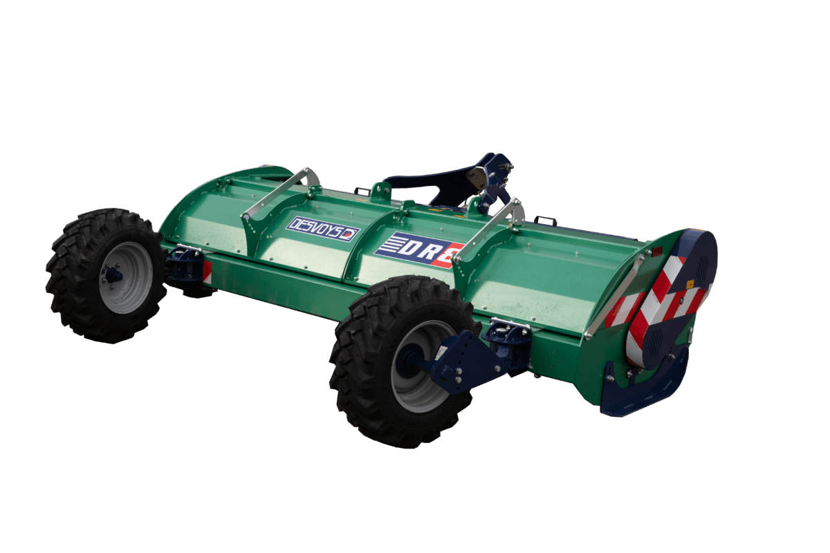 Largeur 3,20m. Caisse dotée de 3 poutres de fortes sections. Grand volume intérieur pour les végétations denses. Rotor de 244mm pour une grande rigidité et un diamètre de coupe de 685mm. Épaisseur de caisse de 4mm + une tôle de blindage de 4mm supplémentaire de série. À l’arrière, 2 roues semi-pivotantes ou un rouleau en option. Nombreux montages de couteaux dont le nouveau marteau B9 en option. Poids 1900 kg