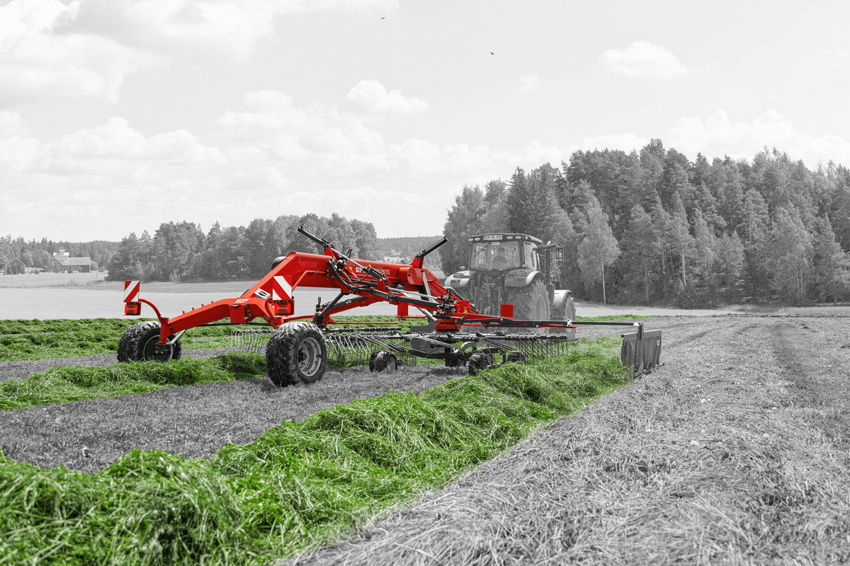 Les andaineurs traînés à 2 rotors sont robustes et efficaces et assurent des andains réguliers, homogènes...
