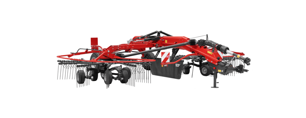 Andaineur central 2 rotors avec largeur de travail de 5.83 à 6.7m réglable hydrauliquement. Triple tandems brevetés SIP (6 roues/rotor), suivi de sol 3D et relevage séparé des rotors.
