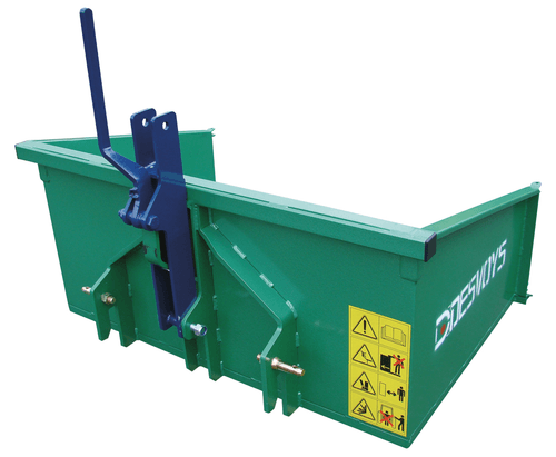 - 1 - Benne ESPACES VERTS : Basculement avant sur bras de relevage ou basculement central sur élément porteur. Attelage étroit catégorie 1 et 1 N sur piton sur barre à trous ou sur bras de relevage suivant modèle. Puissance micro-tracteur de 15 à 30 cv. Volume : 0,260 m³ - 0,310 m³ - 0,390 m³. Charge utile 400 kg (basculement avant) et 600 kg (basculement central). Largeur : 1 m - 1,2 m - 1,5 m. Profondeur : 0,65 m. Poids de 76 à 110 kg. Modèles : 0280 - 0281 - 0287 (basculement avant) 1513 - 1514 - 1565 (basculement central) - 2 - Benne POLYVALENTE TYPE 1 et TYPE 2 : Basculement avant sur bras de relevage ou basculement central sur élément porteur. Attelage catégorie 1 sur piton sur barre à trous ou sur bras de relevage. Puissance tracteur maxi : 75 cv (benne TYPE 1) et 90 cv (benne TYPE 2). Volume : 0,700 m³ - 0,800 m³ - 0,900 m³. Poids de 128 à 232 kg. Largeur : 1,6 m - 1,8 m - 2 m. Profondeur 0,85 m. Poids de 800 à 1 000 kg. Modèles : 0016 - 0017 - 0018 (basculement avant - TYPE 1) 0036 - 0037 - 0040 (basculement central -TYPE 2) - 3 - Benne GRAND VOLUME : Basculement central mécanique sur élément porteur ou central hydraulique par 2 vérins Attelage catégorie 2 en chapes et catégorie 2 et 3 en chape (version hydraulique). Puissance tracteur maxi : 100 cv (version mécanique) et 110 cv (version hydraulique). Volume de 1,150 m³ à 2 m³. Poids de 236 à 615 kg. Largeur de 1,80 m à 2,25 m. Profondeur de 1,05 m à 1,50 m. Modèles : 0020 - 0212 (basculement mécanique) 1325 - 1327 (basculement hydraulique) - 4 - Benne à VIGNE : Basculement avant sur bras de relevage ou basculement central sur élément porteur. Attelage catégorie 1 sur barre à trous ou bras de relevage (basculement avant - modèle 0324) et catégorie 2 en chapes (basculement central - modèle 0517). Modèles : 0324 (rangs de vigne) - largeur 1,32 m - profondeur 0,85 m - volume 0,560 m³ 0517 (grand volume vignoble) - largeur 2,20 m - profondeur 1,45 m - volume 1,800 m³