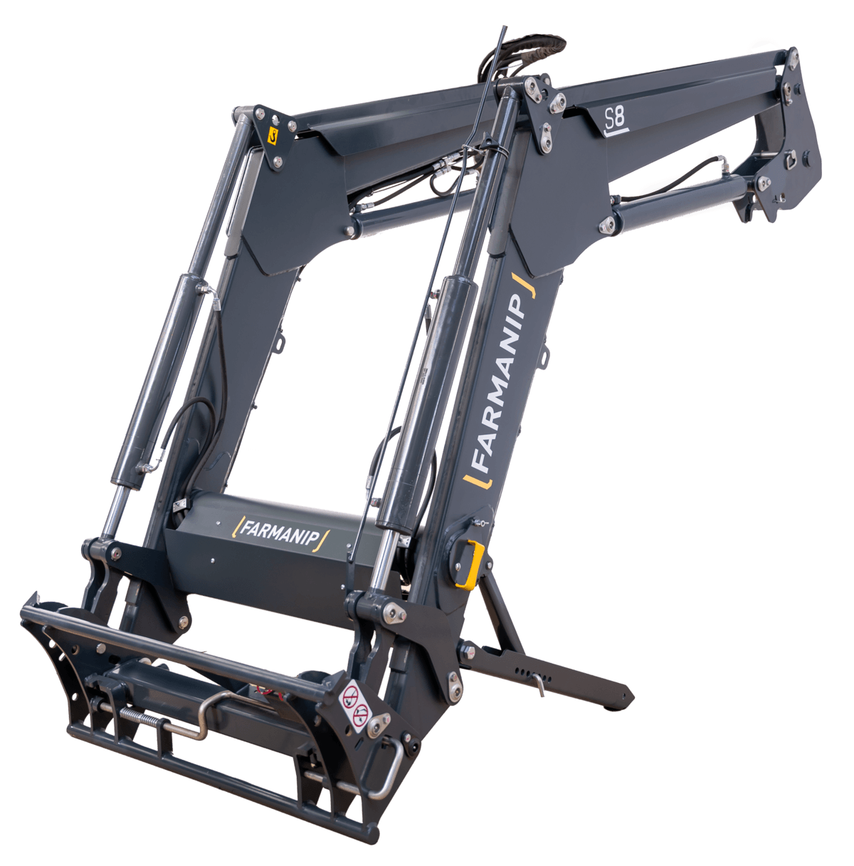 Chargeur S8. Compatible pour tracteurs de 80 à 130 cv. Hauteur de levée à l'axe de l'outil : 3,8m. Angle de cavage au sol: 49°. Angle de déversement à hauteur maxi: 55°. Charge utile à 0,80m de l'axe de rotation de l'outil (calculée avec un outil de 180 kg) : - au sol : 1650 kg. - à 2m du sol : 1700 kg. - à hauteur maxi : 1600 kg.