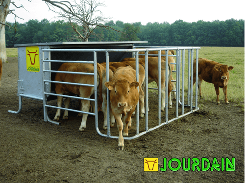 Nourrisseur 2,2 m ou 3 m avec auge anti gaspillage de grande dimension. Livré avec enclos relevable pour l'alimentation des bovins encornés.