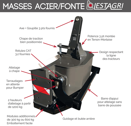 Lestagri, entreprise familiale Française a développé 2 gammes de masses : EUROMASSE, gamme 100 % fonte de masses monoblocs et évolutives de 400 à 2 850 kg et LESTAGRI, gamme acier-fonte de masses monoblocs et évolutives de 250 à 2 000 kg, nombreux accessoires disponibles. Le soin apporté au concept, à l’esthétique, à la fabrication et la sécurité, sont les meilleurs gages de qualité et de fiabilité. Fabrication Française