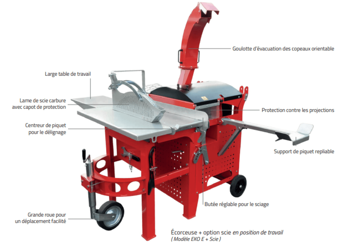 Une gamme pour écorcer des piquets de Ø40 à Ø250 mm pour une longueur de 1,5 m à 3 m. Disponible en entraînement électrique ou prise de force tracteur. Construit en mécano-soudée avec peinture thermolaquée. Goulotte d’évacuation des copeaux orientable. 4 couteaux d’écorçage. Divers équipements en options.