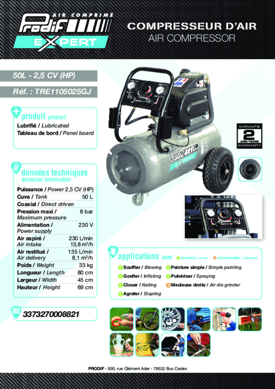 Débit aspiré : 230 L/min, débit restitué : 135 L/min, 8 Bar.