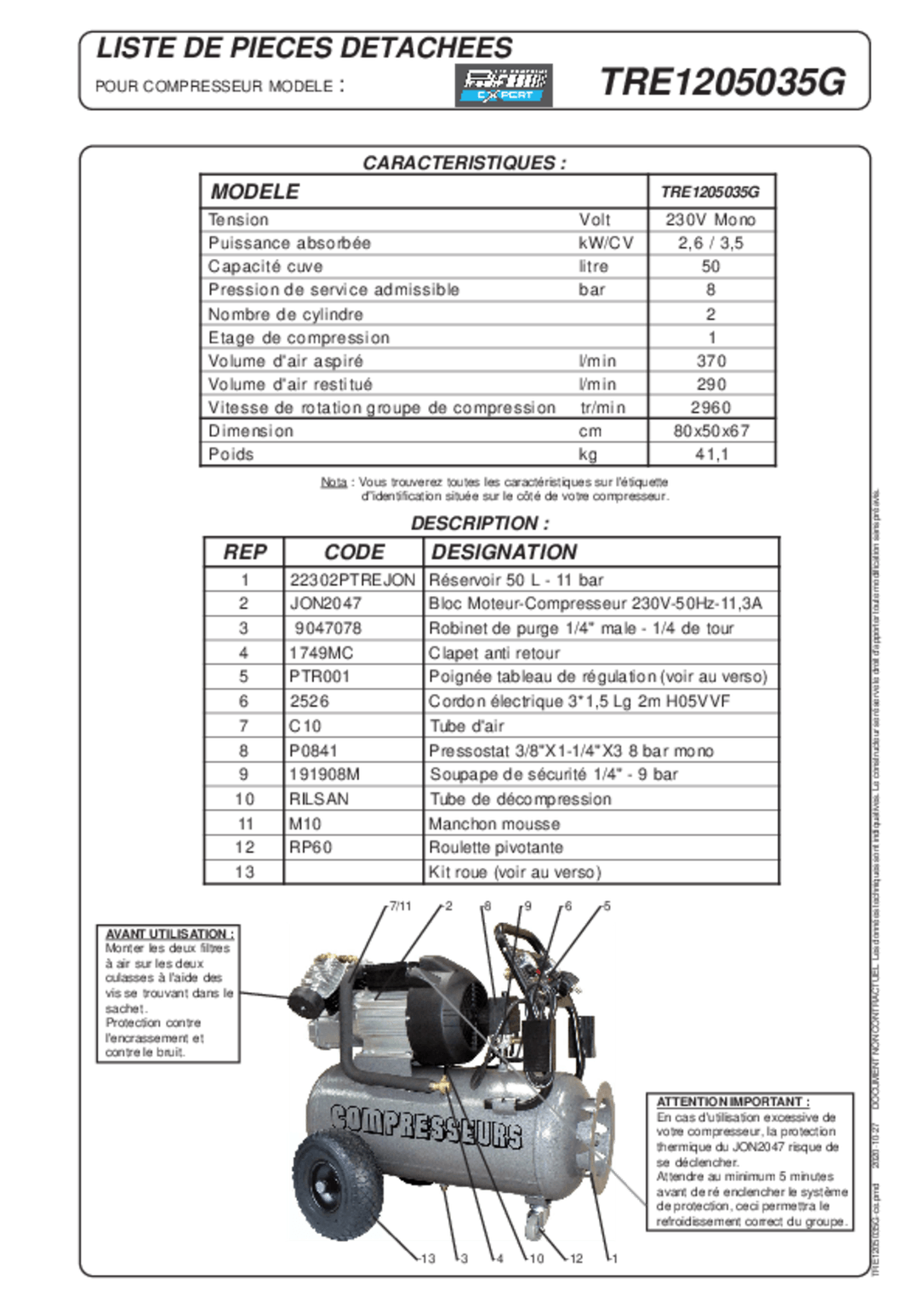 - Compresseur monophasé 50 L 8 Bar 3,5 CV