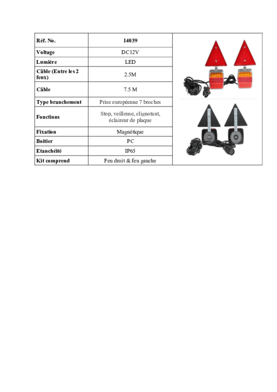 12 V. 2,5 m entre les 2 feux. Câble : 7,5 m. Aimant au dos.