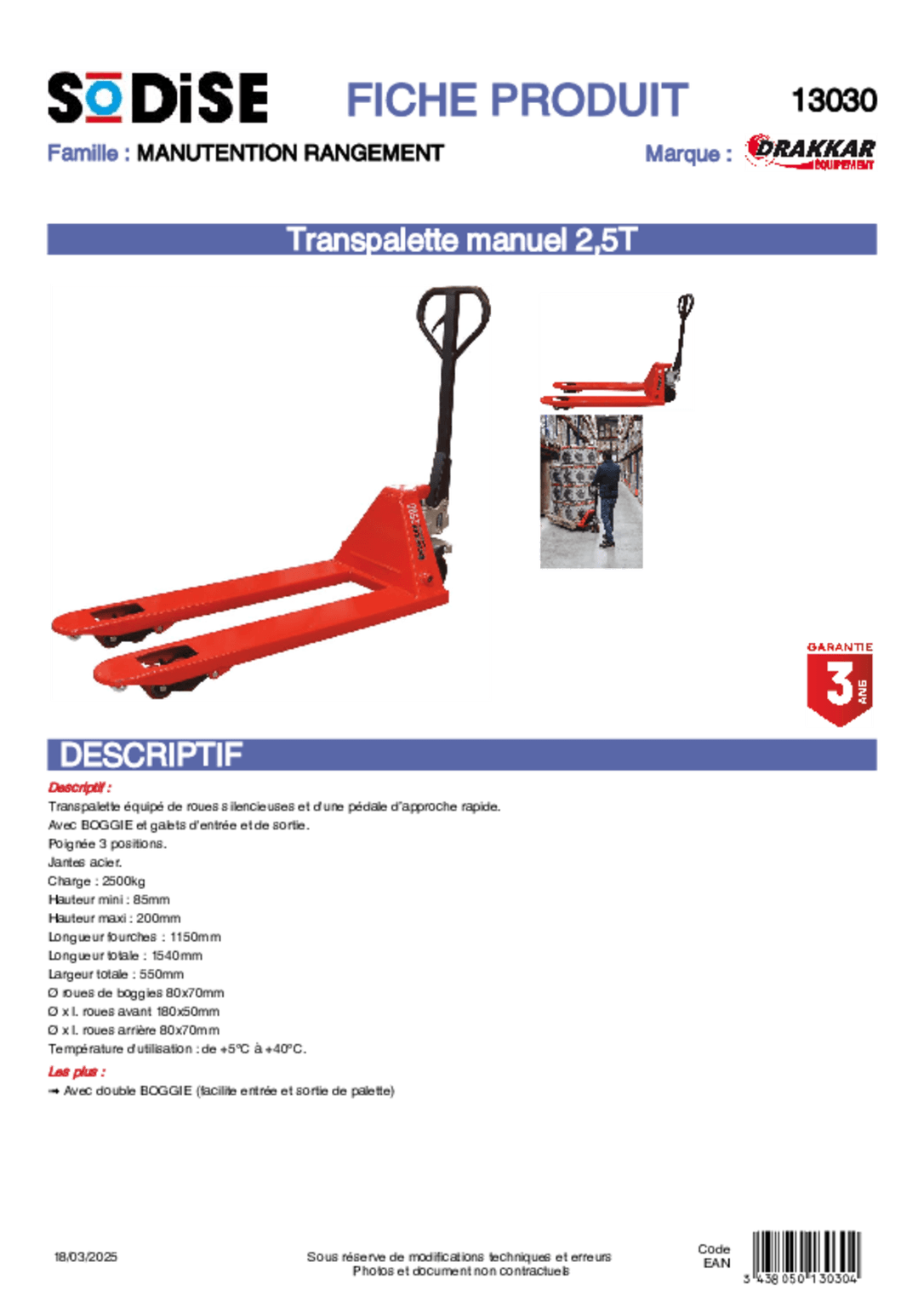 Transpalette manuel. Capacité : 2,5 T. Longueur des fourches : 1150 mm. Largeur des fourches : 550 mm. Hauteur du sol min/max : 85/200 mm. Poignée 3 positions. Roues silencieuses : avt 180x50 mm, arr 80x70 mm (Ø x l). boggies et galets d'entrée et de sortie. Température d'utilisation : de +5°C à +40°C.
