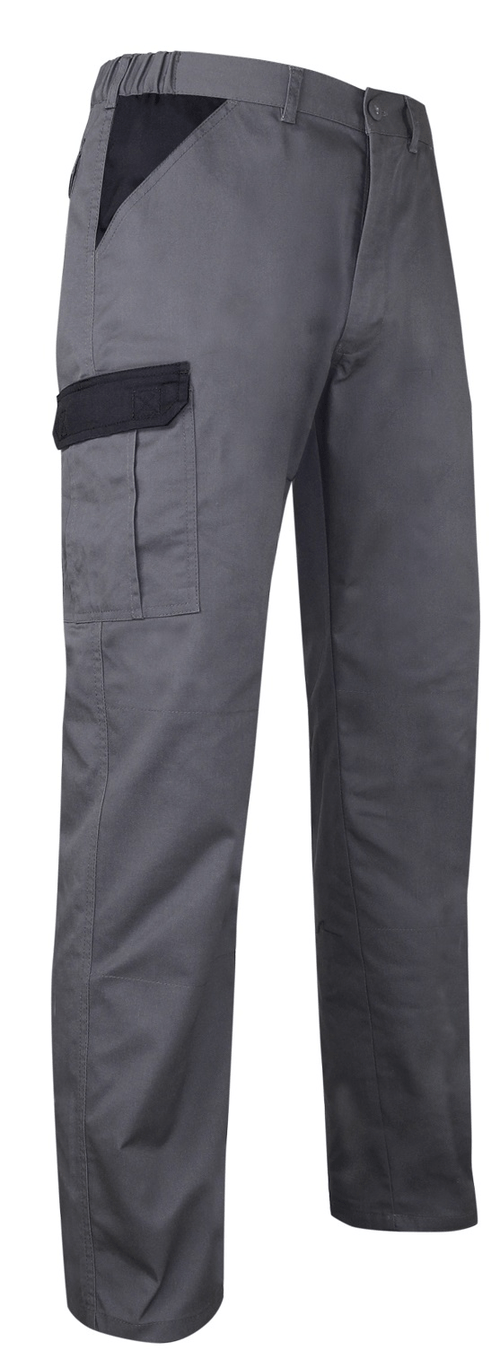 Pantalon. Modèle Perceuse. <br />Bicolore : gris, noir. 65 % polyester, 35 % coton. 245 g/m². <br />Ceinture élastiquée côtés. Braguette zip spirale. 2 poches italiennes. <br />1 poche cuisse droite à rabat auto-agrippant avec ouverture porte mètre. 1 poche cuisse gauche zippée. 1 poche dos à rabat auto-agrippant. Taille du 38 au 50