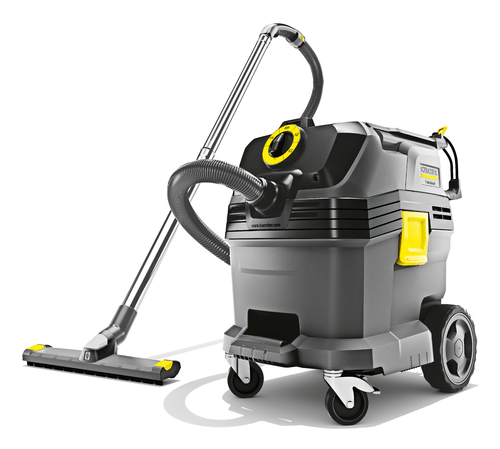 Aspirateur d'eau et de poussière, NT 30/1 TACT L. Puissance : 1380 W. Dépression : 254 mBar. Débit d'air : 74 L/sec. Capacité de la cuve : 30 L. Niveau sonore : 69 dB(A). Poids : 13,5 kg. Filtre plissé plat, PES. Flexible d'aspiration complet : 2,5 m. Suceur eau et poussières 360 mm. Suceur pour fentes. Turbine d'aspiration sans entretien. Sac filtrant non tissé. Arrêt automatique lorsque le niveau maximal est atteint. Système de filtration Eco. Coude. Décolmatage du filtre : système de décolmatage Tact Filter Clean. Classe de protection II. Roulette avec frein.